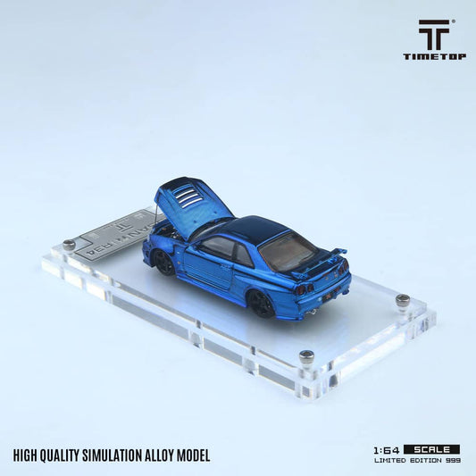 TimeTop x Time Micro 1/64 Skyline GT-R R34 Nismo Z-Tune Chrome Blue Full Carbon Color Gift Box Package