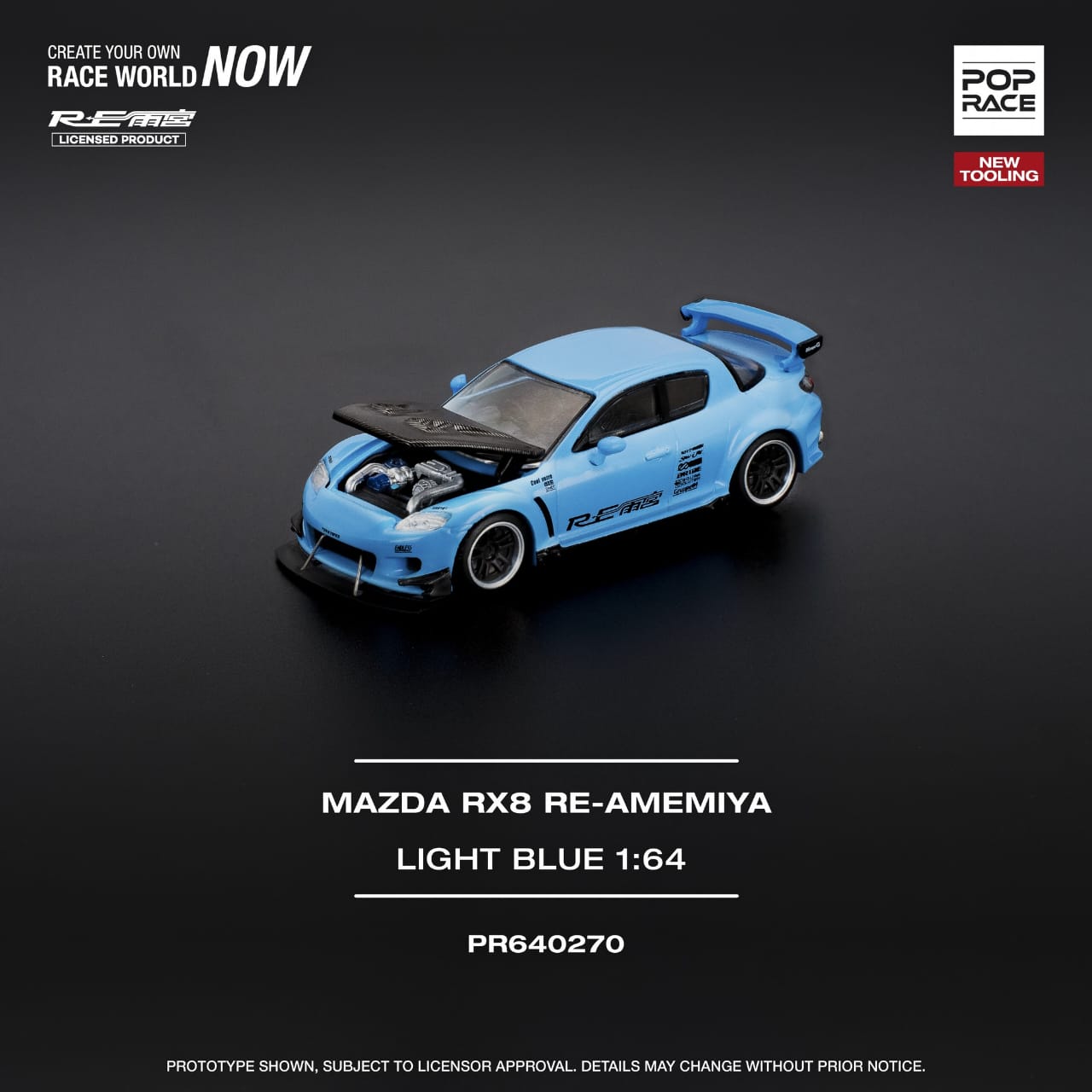 [ETA: Nov 2025 ] Pop Race 1/64 RX-8 Amemiya Modified Light Blue Carbon-Hood(PR640270)