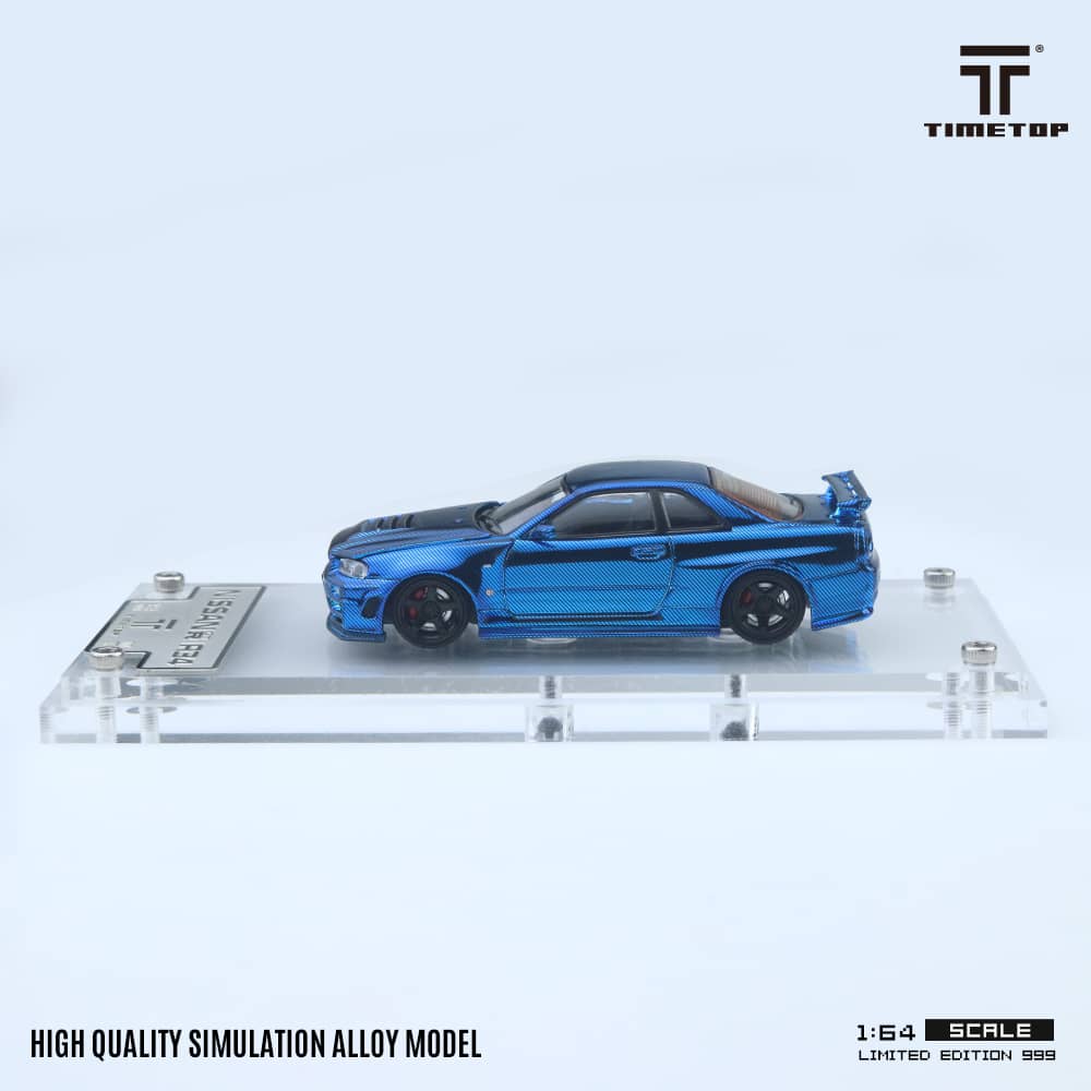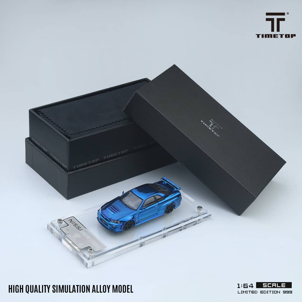 TimeTop x Time Micro 1/64 Skyline GT-R R34 Nismo Z-Tune Chrome Blue Full Carbon Color Gift Box Package